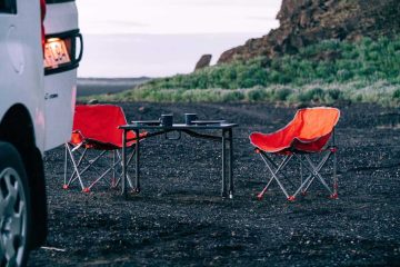 - Kitchen & Dining: A portable gas stove (with one full gas canister), a cooling box/refrigerator, and a sink with a 10L water tank. Includes a pot, frying pan, plates, bowls, mugs, and a full cutlery set for 2 people