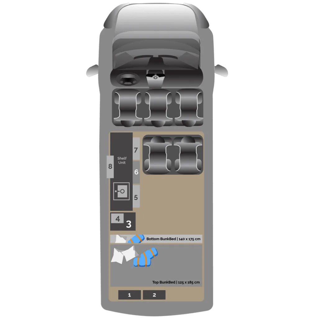 - Double Bed: The rear converts into a comfortable double bed (approx. 110 x 200 cm), providing a flat and cushioned sleeping surface.